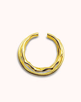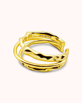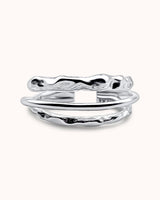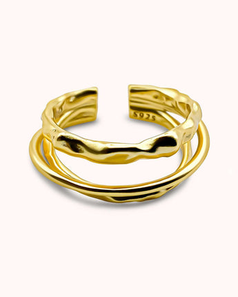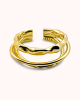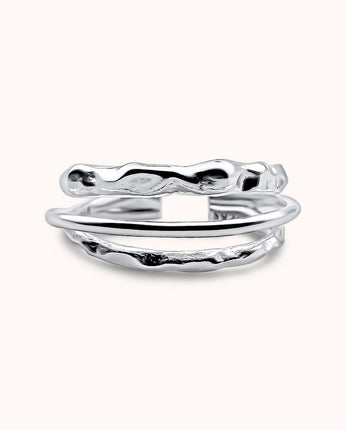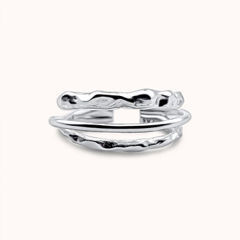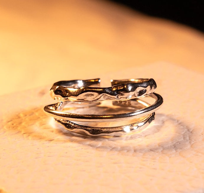 This striking ring features a delicate central layer flanked by two irregular, textured layers that curve gracefully around your finger.